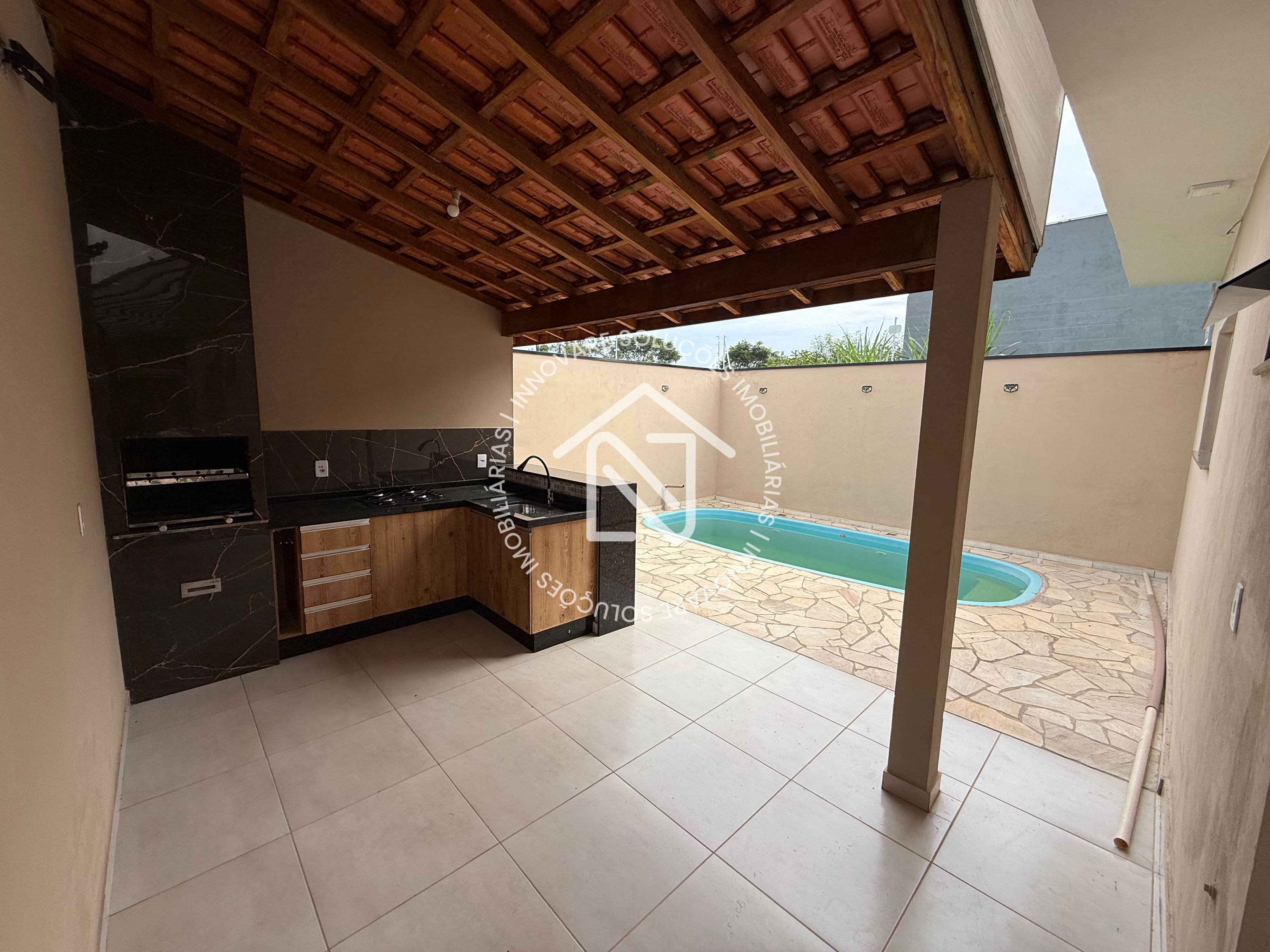 Nos fundos do imóvel possui uma área gourmet com piscina e lavábo.